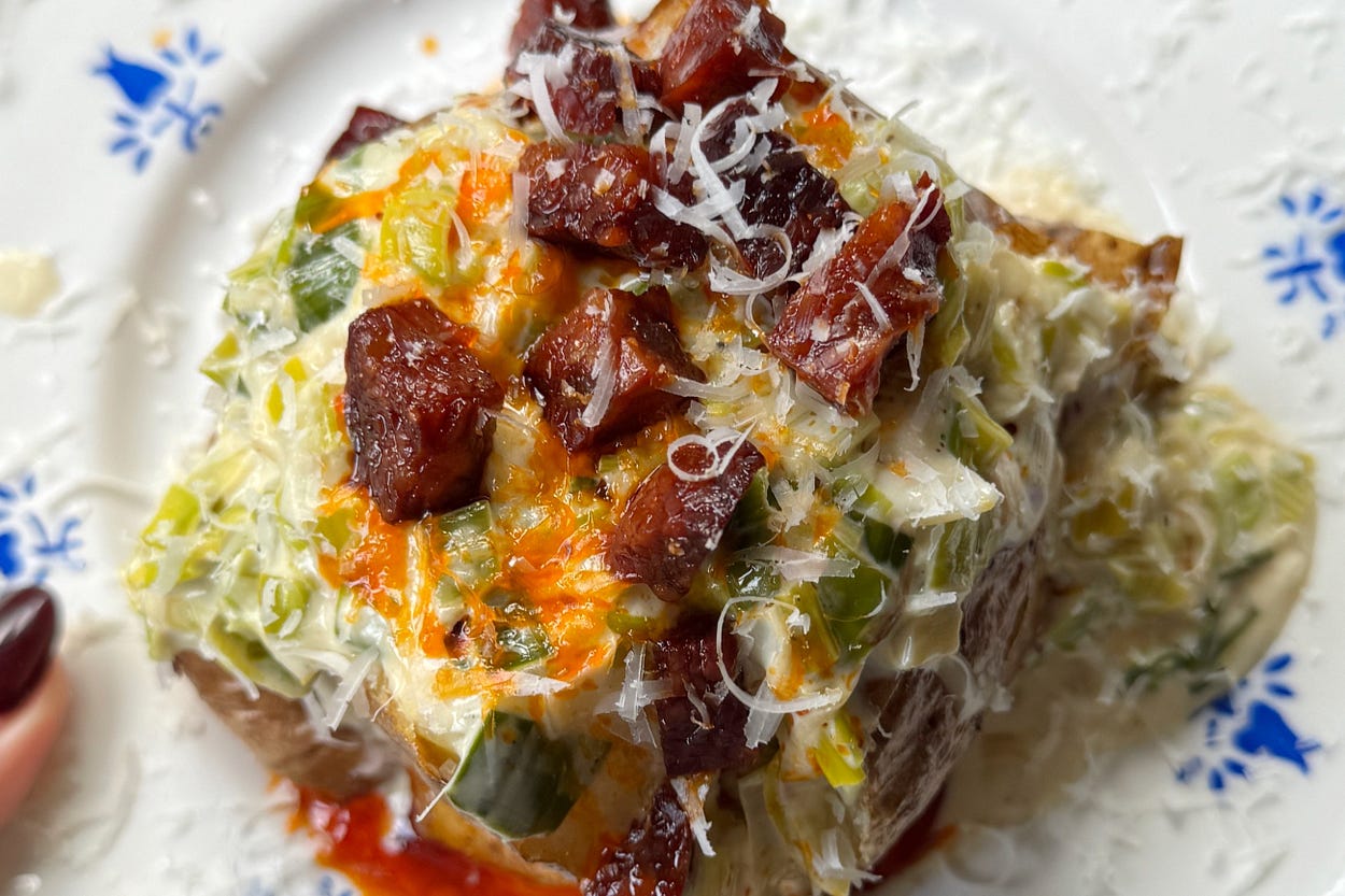 Cheesy Creamy Leek Baked Potatoes with Chorizo